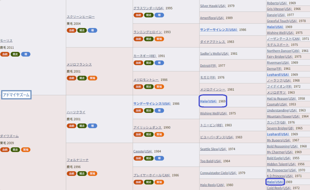 アドマイヤズームも母がヘイロー3×4のクロス。