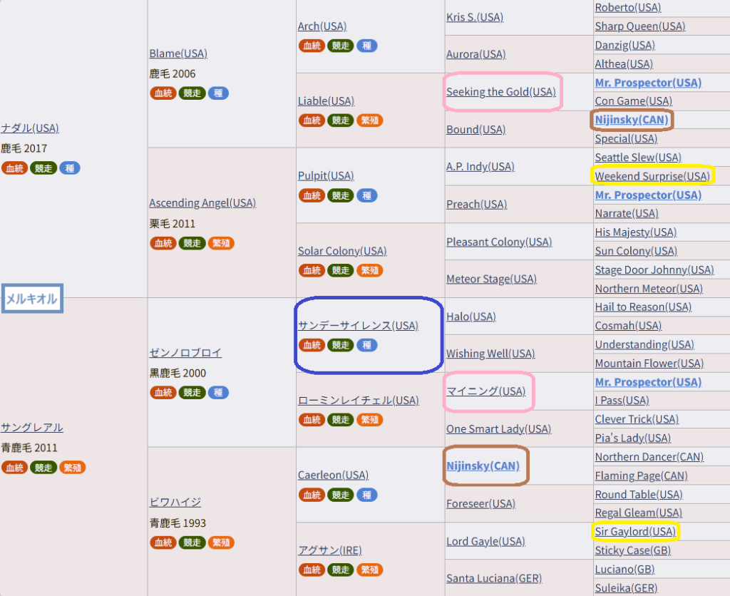 こちらもピンク色シーキングザゴールド≒マイニングのニアリークロスがあって、あとはニジンスキーのクロス。
