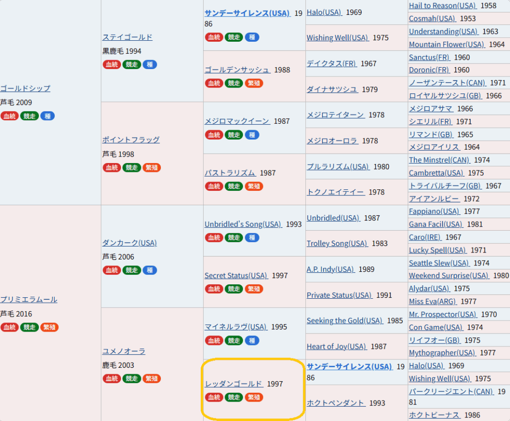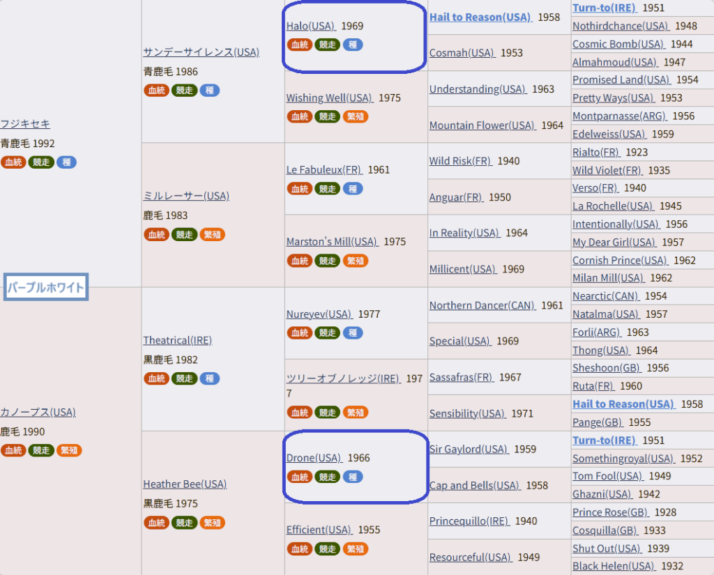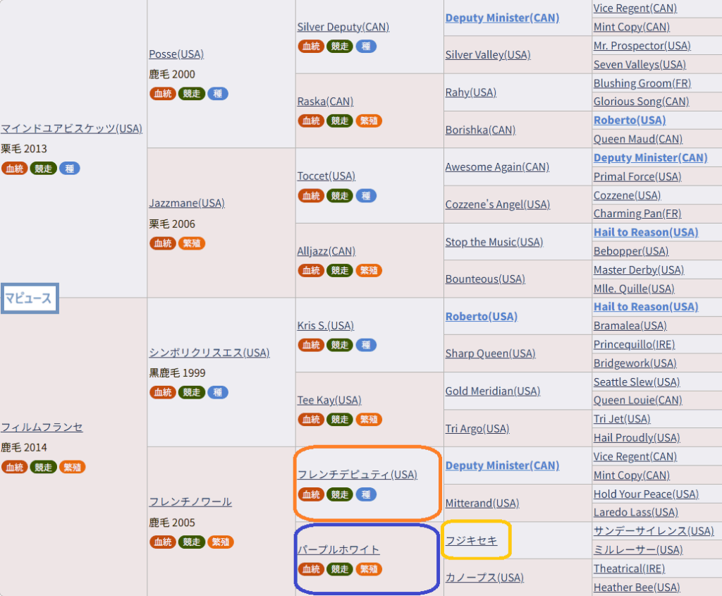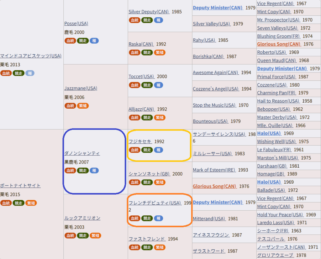 黄色フジキセキとオレンジ色フレンチデピュティがあって、青色ダノンシャンティがヘイローのクロス。